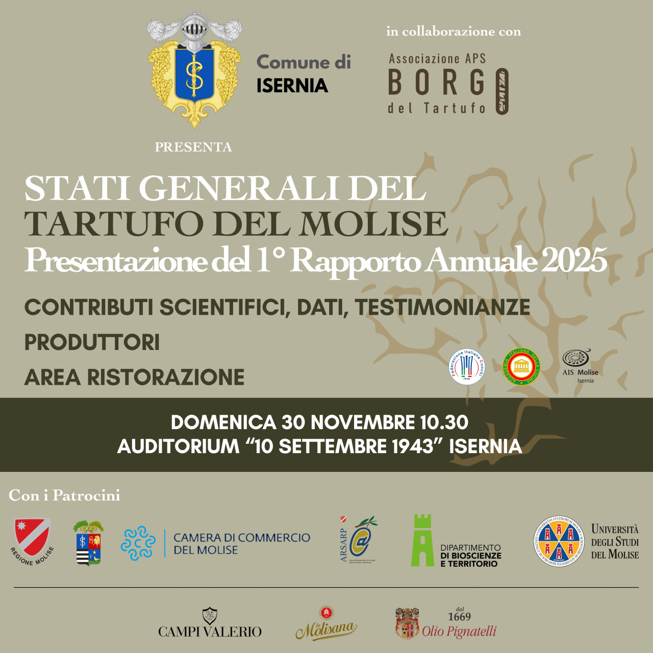 Stati Generali del Tartufo del Molise – Presentazione del 1° Rapporto Annuale 2025Domenica 30 novembre 2025 – Auditorium “10 Settembre 1943”, Isernia Il Comune di Isernia, in collaborazione con l’Associazione APS Borgo del Tartufo, annuncia la prima edizione degli Stati Generali…