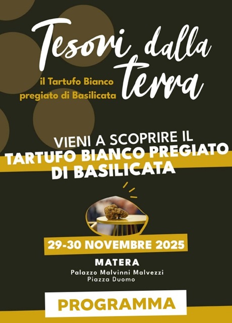 Domenica 30 novembre 2025 dalle ore 10 alle ore 21 nel Palazzo Malvinni Malvezzi a Matera è in programma “Tesori dalla Terra” la grande manifestazione di promozione del Tartufo Bianco Pregiato Lucano e Asta Mondiale del Tartufo Lucano in collegamento…