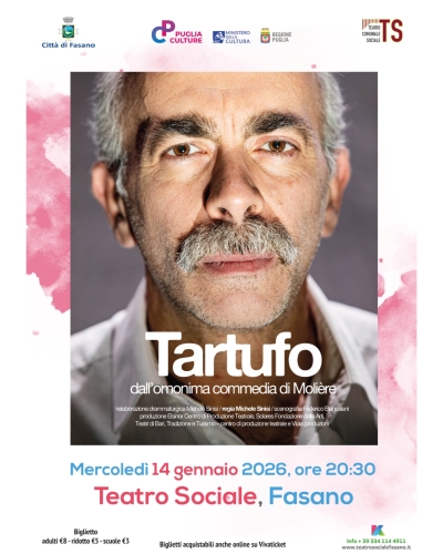 – Il cartellone artistico di Katharà propone un nuovo e interessante appuntamento per tutti gli spettatori del Teatro Sociale di Fasano.Mercoledì 10 gennaio alle 20:30verrà portato in scena “Tartufo”, spettacolo tratto dall’omonima opera di Molière, rielaborata drammaturgicamente daMichele Sinisi, attore, regista teatrale e drammaturgo, Premio della Critica nel 2016 assegnato da ANCT e più volte segnalato ai Premi Ubu.